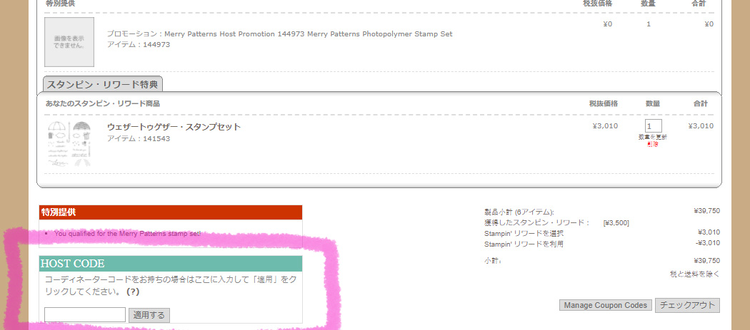 そしてコードを入力するのは、チェックアウト場面の部分!